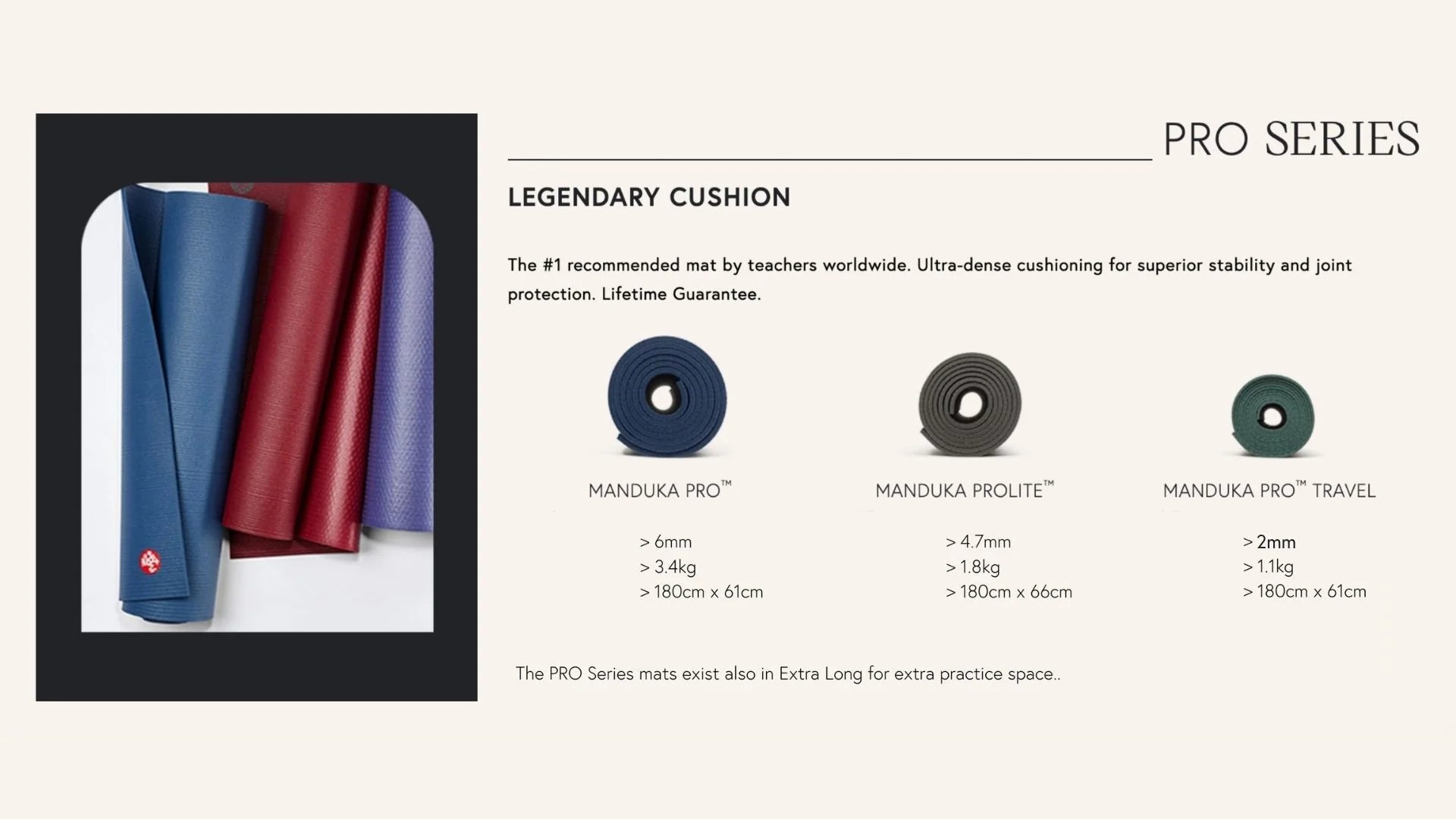 Profissionalmente recomendada, a nossa coleção de tapetes da Série PRO reúne os melhores tapetes de yoga, projetados para atender diferentes preferências e estilos de prática. Disponíveis em diversos comprimentos e espessuras, os tapetes PRO oferecem o equilíbrio ideal entre conforto, suporte e estabilidade em cada pose.